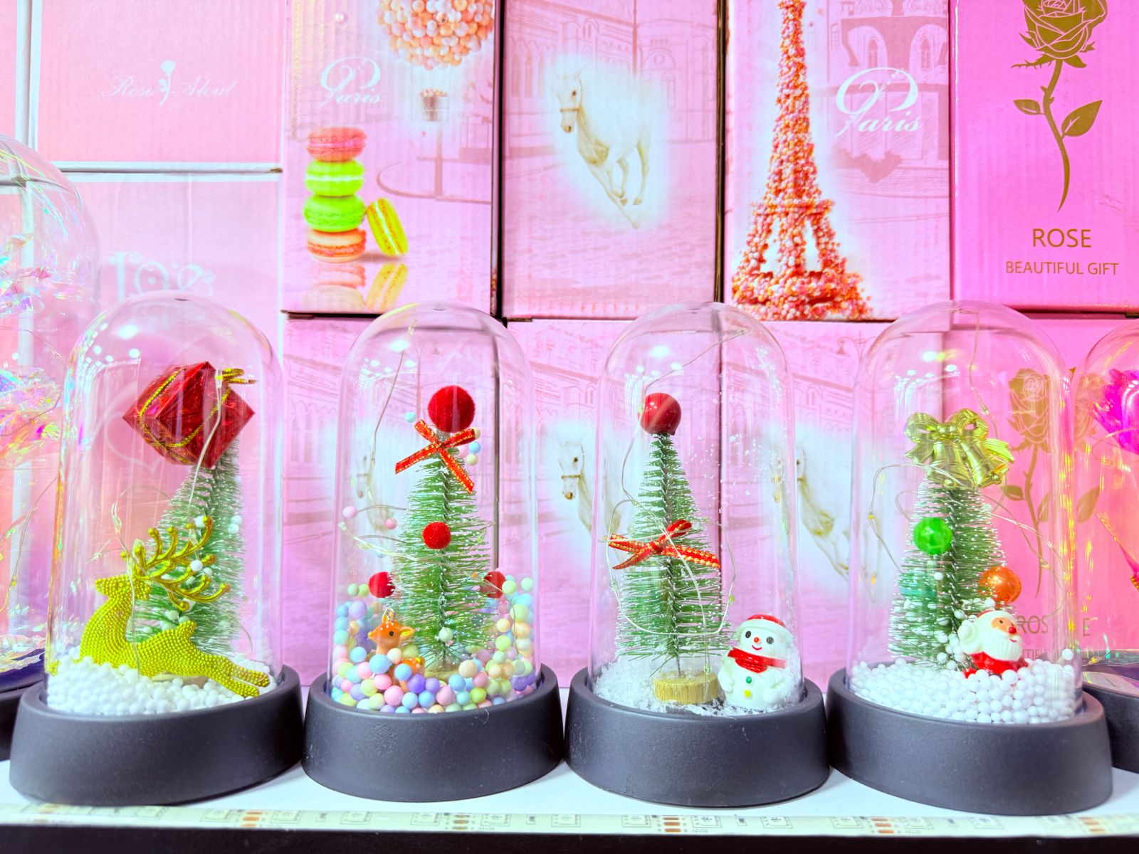 Estos productos son adorables adornos navideños tipo campana de cristal. Cada pieza viene en una base negra y cubierta transparente que protege y realza la decoración interior. Dentro de cada campana se encuentran mini arbolitos de Navidad decorados con esferas, lazos y detalles festivos como: