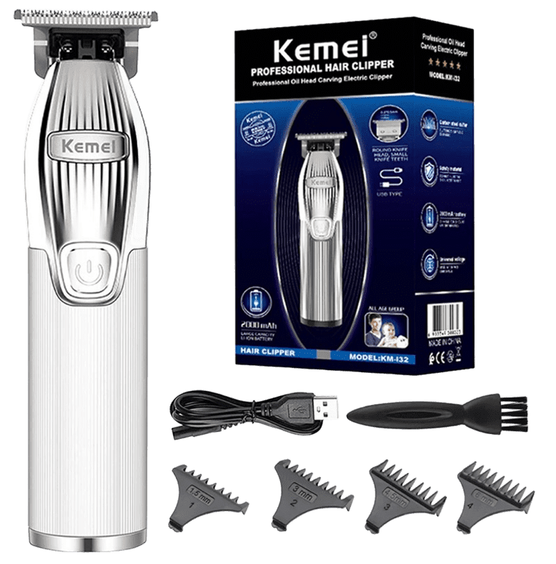 Máquina peluquera Kemei KM-I32, perfecta para uso doméstico y barberías. Diseño ergonómico, potente motor y cuchillas duraderas.