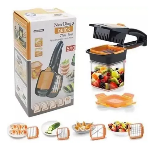 Nicer Quick 5 en 1, compacto y versátil, permite cortar, picar y rebanar frutas y verduras de manera rápida y uniforme. Seguro y fácil de limpiar.