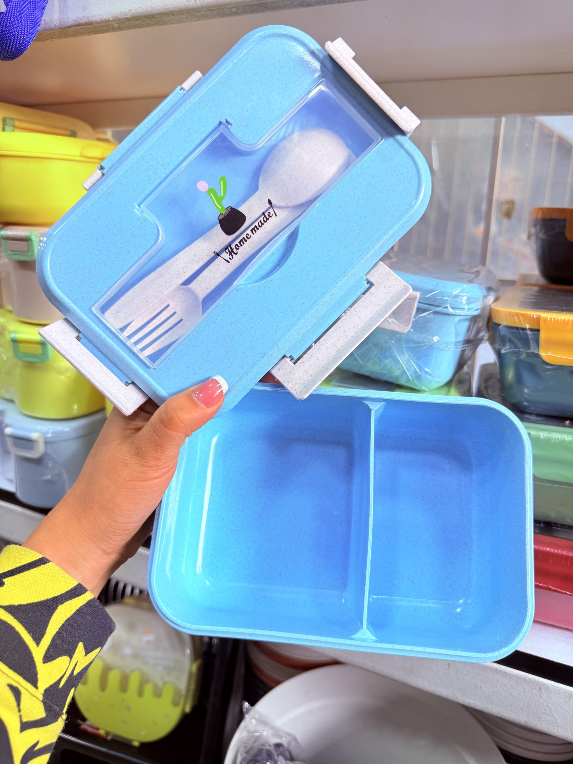 Porta comida 2 divisiones , 4 colores disponibles , con cuchara y tenedor ,