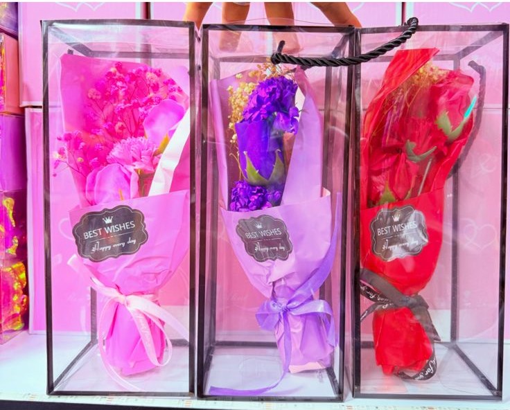 Ramo decorativo de flores en caja de lujo transparente 🌸🎁, ideal para regalar en ocasiones especiales.